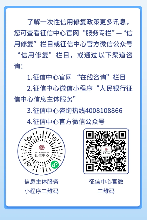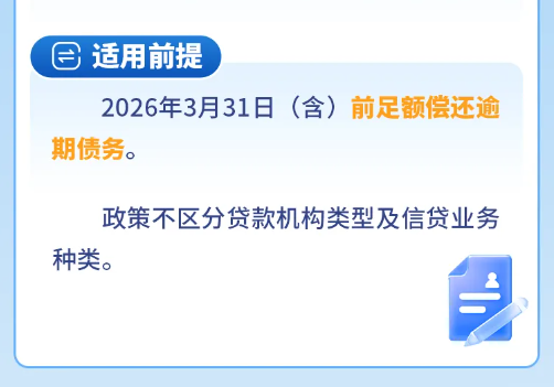 而这些变化都源于2025年12月22日中国人民银行发布的一次性信用修复政策有关安排。根据安排,对于2020年1月1日至2025年12月31日期间,单笔金额不超过10000元人民币的个人逾期信息,个人于2026年3月31日(含)前足额偿还逾期债务的,金融信用信息基础数据库将不予展示。