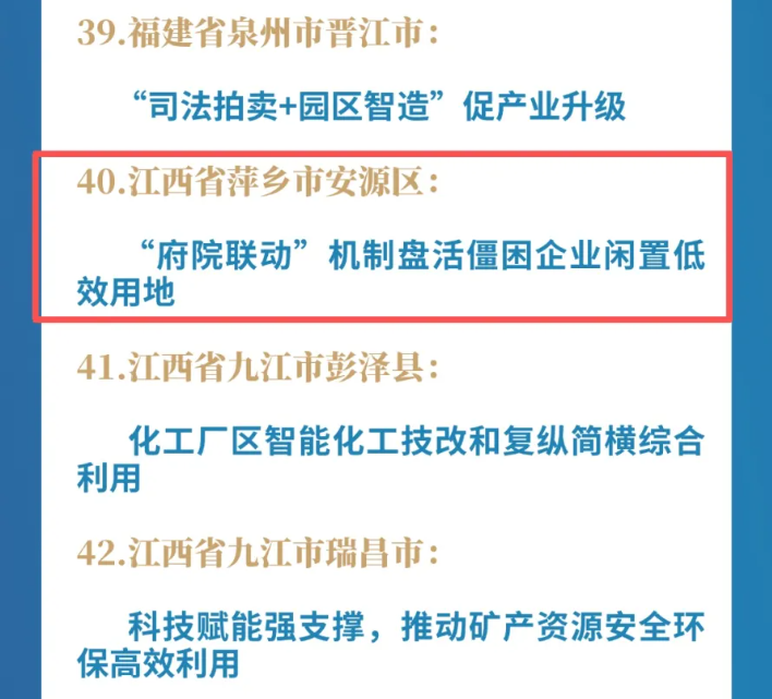 日前,全国首届自然资源节约集约示范县(市)创建成果发布,共推出河北、安徽、山东等11个示范创建省级管理特色做法,以及北京市石景山区等82个典型示范县(市)“四个创新”的典型经验。其中,萍乡市安源区“府院联动”机制盘活僵困企业闲置低效用地入选典型示范名单。