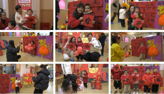 走进托育中心,金元宝、福字挂饰、卡通小马灯笼将场地装点得红火热闹,孩子们身着节日服装,拉着爸爸妈妈的手在主题背景板前合影留念,现场洋溢着温馨的节日气息。