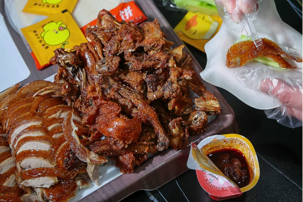 枣红油亮的鸭皮,泛着焦糖般的光泽,片片薄如蝉翼。一口咬下,油脂轻爆,香而不腻。用烤鸭饼裹上鸭肉、葱丝与甜面酱,脆嫩与咸鲜交织,满口都是踏实感的满足。鸭架炸得椒盐酥脆,连骨头都嚼得喷香!