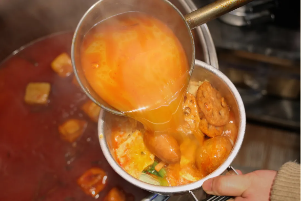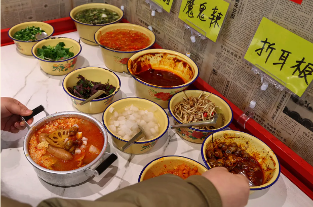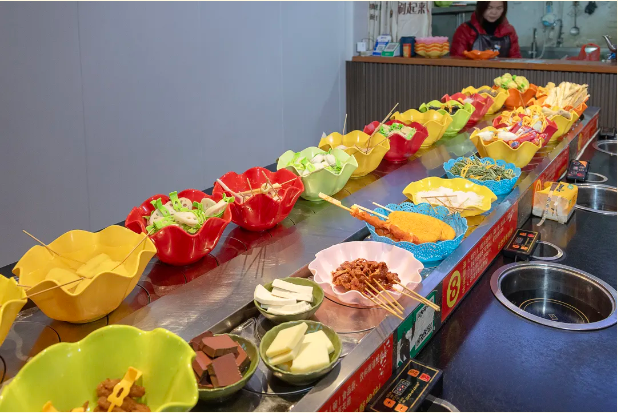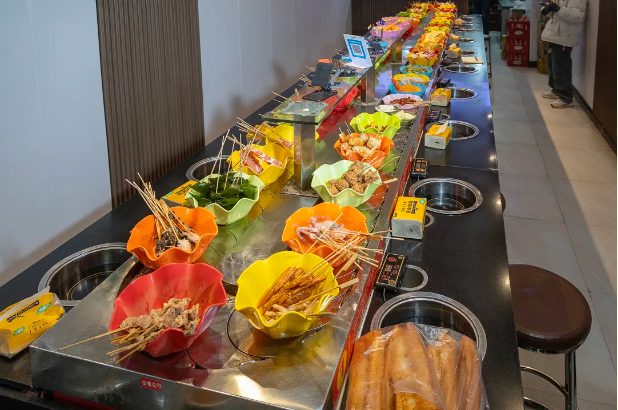 旋转小火锅:一人一锅,红汤滚烫餐碗流转,一人一锅,自在随心。红油锅底翻滚如热血,辣而不燥;骨汤奶白醇厚,暖胃亦暖心。腐竹面筋吸饱汤汁,咬下瞬间迸发鲜香。蘸料随心配,就像青春,口味自选,热情自燃。