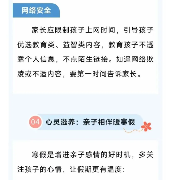 健康和安全,是给孩子最好的假期礼物。愿家长们陪孩子们度过一个平安、快乐、充实的寒假,以满满活力迎接新学期!