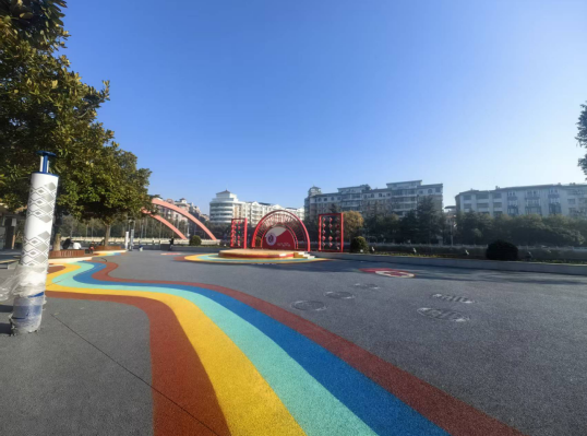 公园内的景观文化构架上还精心展示了五十六个民族的代表乐器,从马头琴到芦笙,从都塔尔到象脚鼓……每一件乐器都是民族文化的缩影,共同编织成中华文化多元一体、和谐共生的优美旋律。地面艺术铺装以中国传统五音“宫、商、角、徵、羽”为元素,结合彩虹色带与跃动音符,象征各民族文化交融互鉴,共同谱写出民族团结的盛世华章。