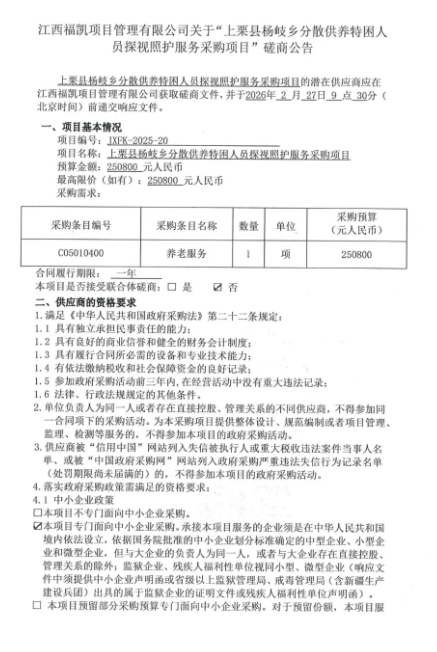 江西福凯项目管理有限公司关于“上栗县杨岐乡分散供养特困人员探视照护服务采购项目”磋商公告