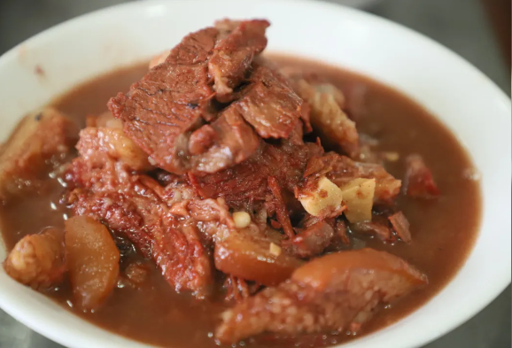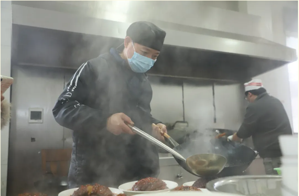 食堂大厅内,“情暖特困老人 共享团圆年夜饭”的横幅醒目挂起,红对联、福字与红灯笼相映成趣。后厨里,烟火气裹挟着饭菜香扑面而来,两位厨师与工作人员忙而不乱,掂勺翻炒、切菜端盘,动作有条不紊。“老人们大多牙口和肠胃不佳,今天的菜特意炖得软烂、口味清淡,让大家吃得舒服、放心。”厨师黄良一边忙碌,一边介绍着菜品的准备细节。