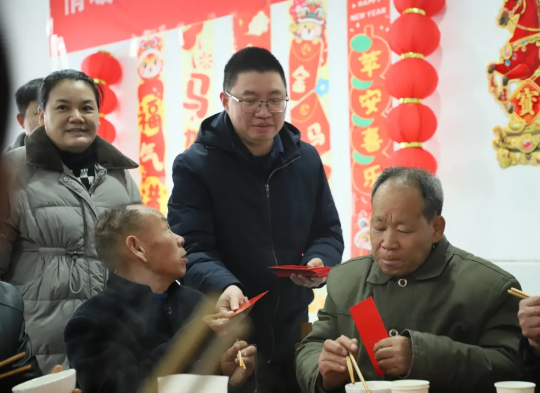 席间,下埠镇政府负责人来到老人中间,高举饮料杯笑着送上祝福:“来,大家一同举杯,提前祝各位老人家新年快乐!”随后,随后,他挨个为老人们分发红包送上祝福。栗塘村老人张理明满脸满足:“在这里吃得好、聊得欢,我很幸福,感谢党和政府记着我们这些特困老人。”