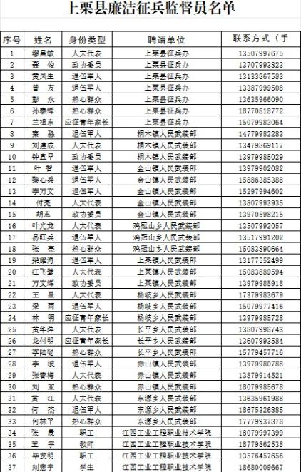 近年来,上栗县征兵办公室严格按照上级要求,狠抓廉洁征兵风气建设,要求所有征兵工作人员严格遵守纪律要求。我们郑重承诺:一定阳光、公开、公平征兵,坚决维护征兵工作的公正性、严肃性,对征兵违纪违法问题做到“零容忍”,切实维护广大人民群众的基本利益。为此,我们诚恳邀请广大市民朋友共同监督,也希望大家增强防范意识。