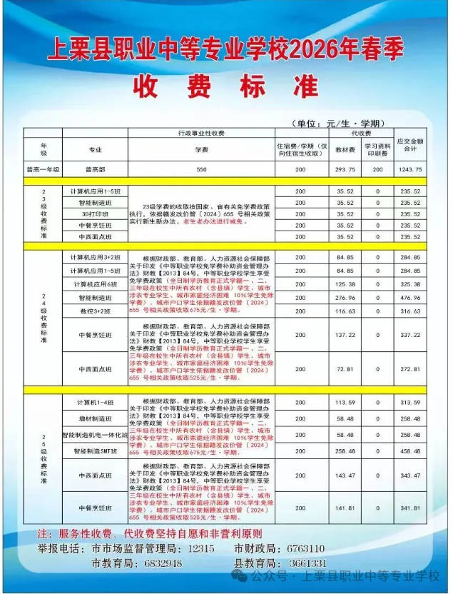 上栗县职业中等专业学校2026年春季收费标准