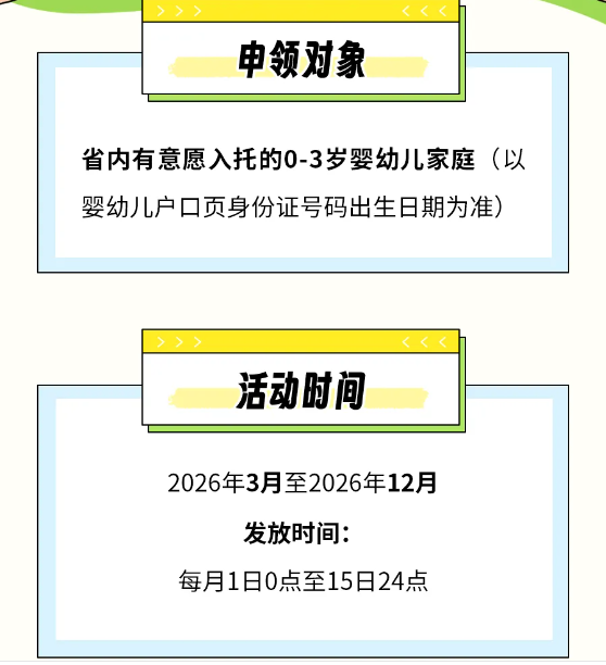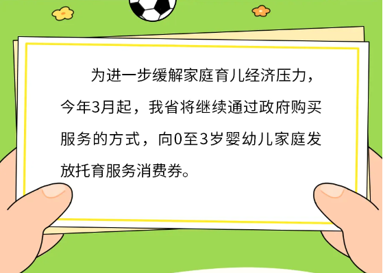 3月3日,记者从省卫生健康委获悉:为进一步缓解家庭育儿经济压力,本月起我省继续通过政府购买服务的方式,向0至3岁婴幼儿家庭发放托育服务消费券。