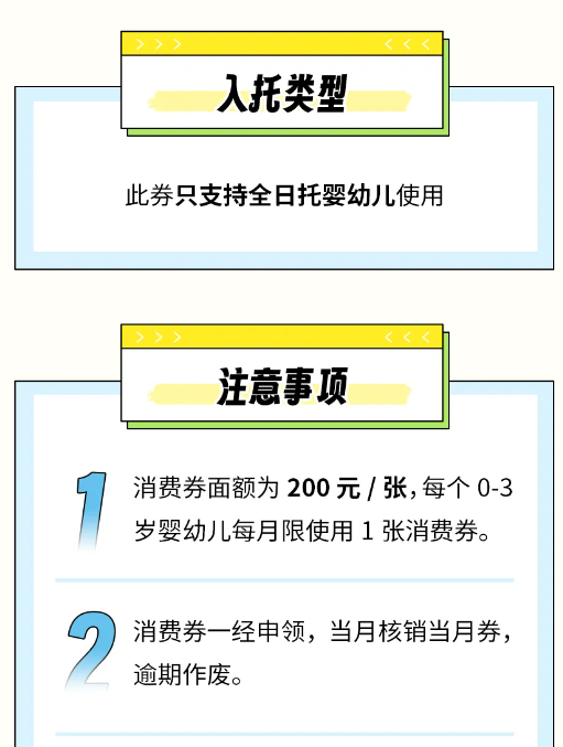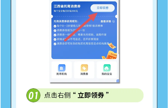 据了解,托育服务消费券面值为200元,可用于抵扣全日托服务费用,每孩每月可用一张。省内有意愿入托的0至3岁婴幼儿家庭可通过省卫生健康委官方微信公众号“江西卫生健康”或“赣服通”卫健专区,提交婴幼儿及本人身份信息等相关材料,经系统核验通过后即可领券。