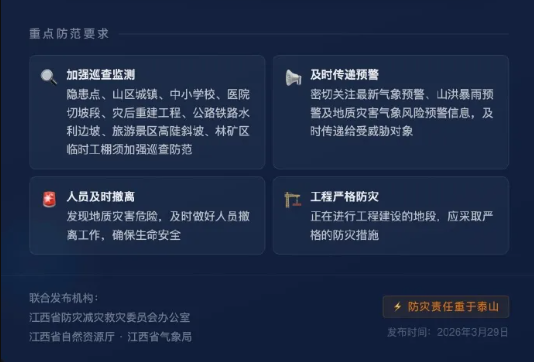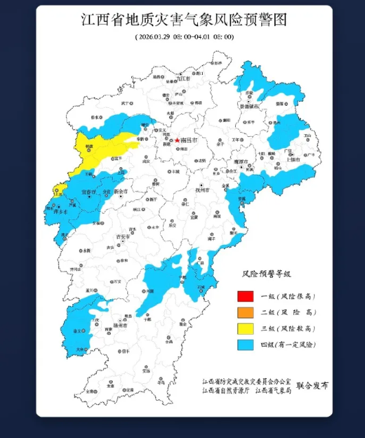 根据前期降雨实况和降雨量预报,结合地质环境条件和历年地质灾害发生规律分析,预计3月29日8时至4月1日8时:宜春市北部、萍乡市北部等地质灾害高易发区发生崩塌、滑坡、泥石流灾害的风险较高(黄色预警);九江市西南局部、景德镇市北部、上饶市东部、宜春市西南部、萍乡市南部、新余市西部、鹰潭市南部、抚州市东部、赣州市北部等地质灾害高易发区和部分中易发区,有出现小型崩塌、滑坡、泥石流灾害的一定风险(蓝色预警)。