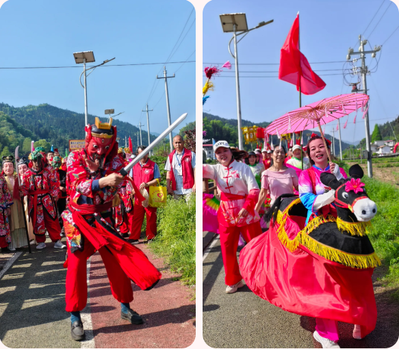 上午9时,随着铜锣敲响,活动正式拉开帷幕。百人 “回娘家”情景巡游重磅登场,狮子舞开道,傩舞、花轿、茶灯队伍、五峰花锣鼓队依次亮相,沿村道巡游展演,还原热闹喜庆的归乡场景,沿途彩旗飘扬、人气高涨,线上同步直播,让更多网友云端感受民俗魅力。