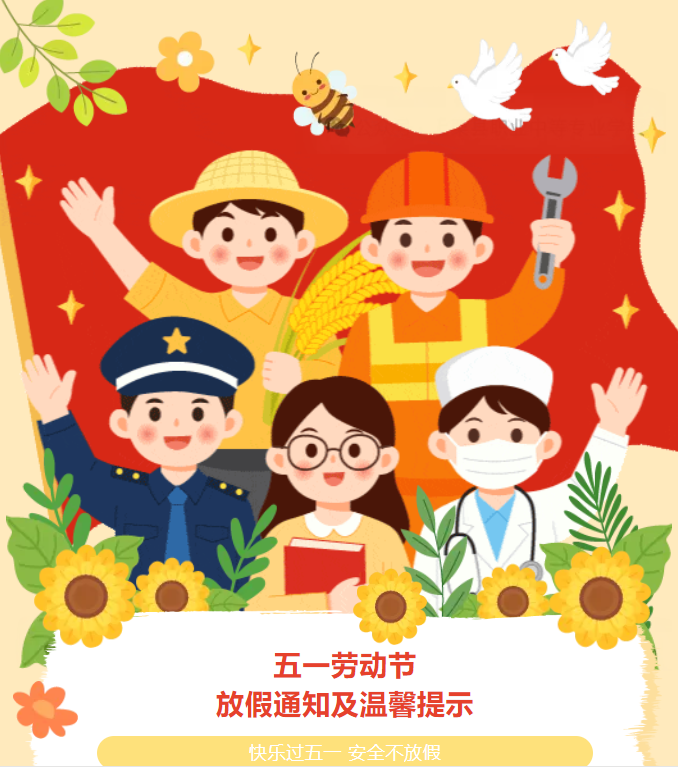 劳动创造美好生活,安全守护幸福家园。希望在这个五一假期里,家长们能够放下工作的忙碌,多陪伴孩子,一起感受劳动的乐趣,体验亲子时光的美好。让我们携手筑牢安全防线,为孩子的健康成长保驾护航。最后,祝愿各位家长和同学们五一劳动节快乐,平安喜乐,万事顺遂!期待假期结束后,看到孩子们精神饱满地回到校园!