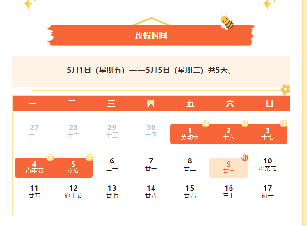 春深四月去,夏来五月新。在这生机勃勃的美好时节,我们即将迎来五一国际劳动节。为了让孩子们度过一个安全、健康、愉快的假期,根据《国务院办公厅关于2026年部分节假日安排的通知》,结合学校实际情况,现将放假安排及相关安全注意事项告知如下,请仔细阅读并配合做好孩子的监护与教育工作。