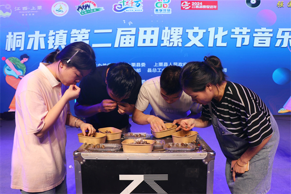 音乐会现场,音符跳动、绚烂飞扬,乐队在舞台上纵情演奏着,《铁血丹心》《我的中国心》《千千阙歌》等一首首经典的旋律引得台下观众齐声唱和,舞蹈《长安啊》《飞天鼓舞》等节目则让大家沉浸在中国传统文化的韵味之中。最让大家期待的就是吃田螺比赛,只听比赛哨声一响,台上的选手们迅速拿起田螺、动作娴熟,手嘴并用,瞬间吸出螺肉,每一个动作都精准到位;观众们在台下加油助威,呼声震天,掀起了现场一个又一个的高潮。