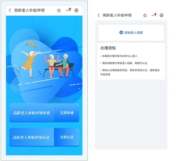 3.选择高龄老人补贴申领申请,添加老人档案,按页面提示完成办理。