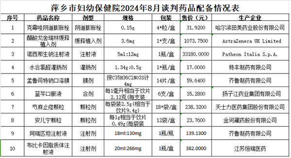 萍乡市妇幼保健院2024年8月谈判药品配备情况