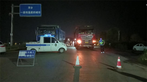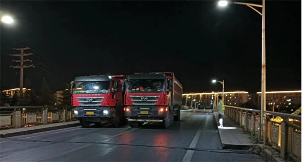 ▲8月5日,晚9时,区城管局队员在大江边大桥维护秩序,两辆大型工程车从桥面上驶过,检测人员正在进行桥梁动载测试。