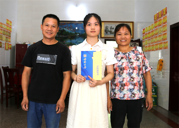 看到快递员手里拿着印有“西南大学录取通知书”字样的邮件袋,黄双和父母甚是兴奋,挂着满脸笑容。经快递员核对身份准确无误后,黄双便在大家的见证下缓缓拆开邮件,取出了沉甸甸的通知书。