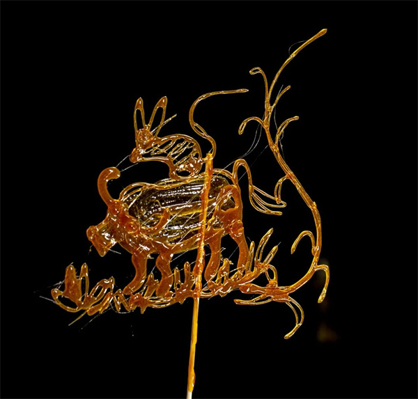 糖画,顾名思义,就是以糖做成的画,它亦糖亦画,可观可食,民间俗称 “倒糖人儿”“倒糖饼儿”或 “糖灯影儿” ,分为平面糖画与立体糖画两种。它是地道的民间画种,颇具街市艺术特色,备受百姓喜爱。