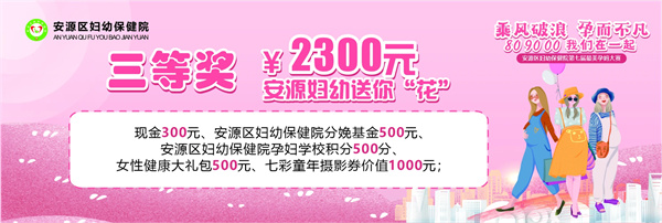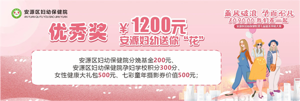 参与奖:所有报名发布平台(抖音、视频号、小红书、朋友圈)的孕产妇均可获得价值199元精美大礼包一份+安源区妇幼保健院孕妇学校积分200分。