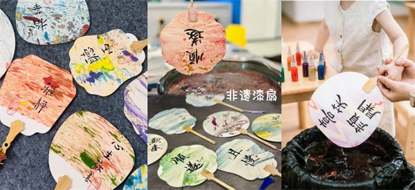 在传统漆扇DIY活动中,你可以在现场选择自己心仪颜色的专用漆滴入在水桶中并滑散,将扇子缓慢放入,没入水中的同时开始匀速旋转至扇面全部没入,就可以得到一把亲手绘制的漆扇啦!