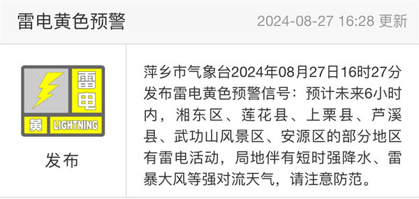 萍乡市气象台发布雷电黄色预警