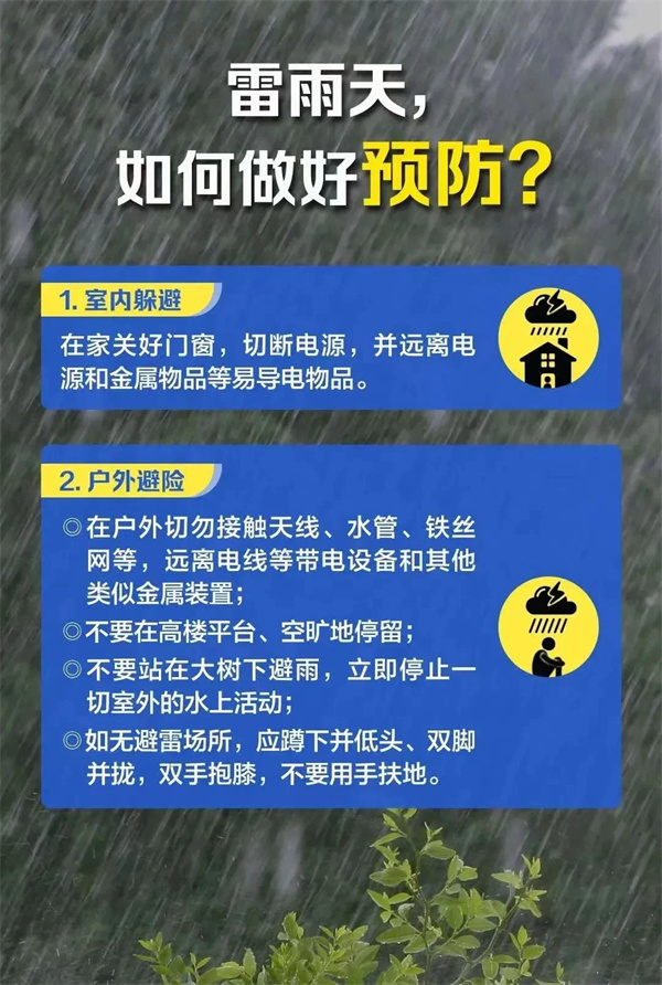 3. 应停止登山、体育、农作、游泳、钓鱼等户外活动(运动),及时躲避到有防雷装置的建筑物。