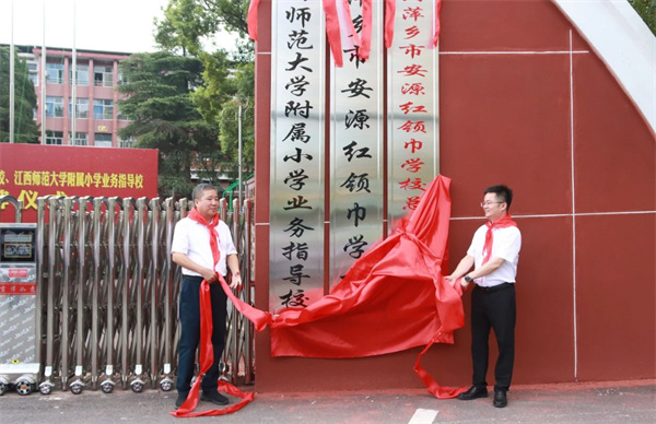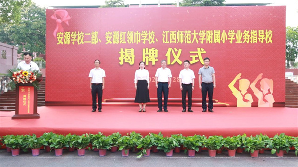 ▲有关领导共同为安源学校二部、安源红领巾学校、江西师范大学附属小学业务指导校揭牌。