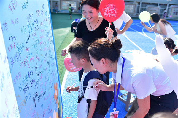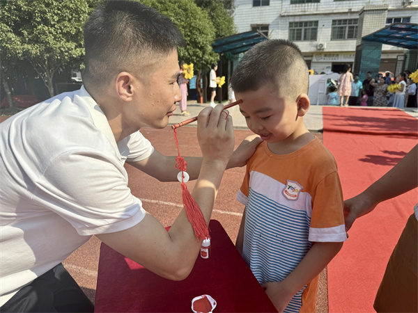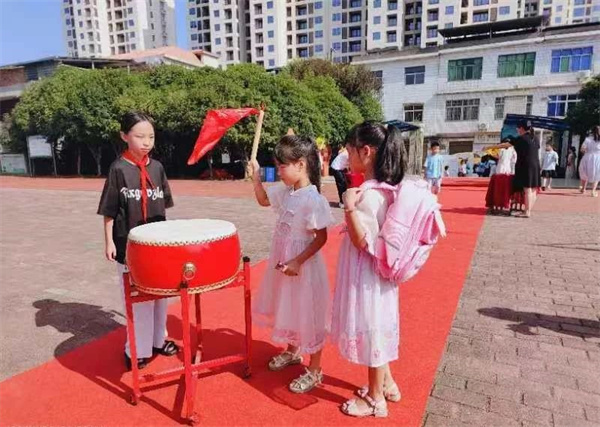 在彭高镇中心小学“‘彭’程万里,梦想启航”新生入学礼。新生入校,获棒棒糖寓意双棒。点朱砂启智,击鼓明志定未来,书写“人”字启蒙心。班主任引领新生入教室,观看短片,开启学习之旅,共筑成长梦。