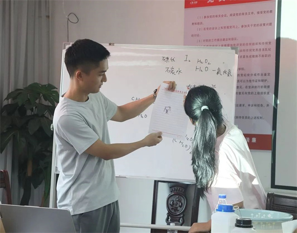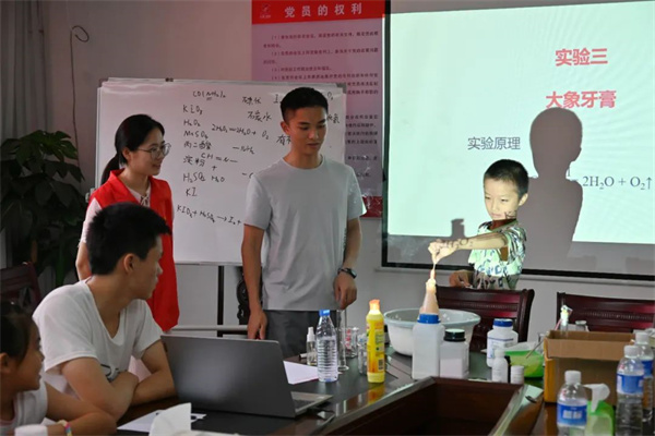 活动特别邀请了该村就读于中国科学院大学化学专业硕博连读研究生甘礼豪,为青少年们介绍化学奥秘,分享化学知识。在实验开始前,甘礼豪详细讲解化学实验的安全注意事项,确保每位学生都能在安全的环境下进行实验。学生们通过一系列精彩纷呈的化学实验,如淀粉溶液写字、碘钟反应和大象牙膏实验等,亲身体验化学的神奇与奥秘。在动手操作过程中,他们不仅学习了化学原理,更深刻理解了化学知识在现实生活中的应用。