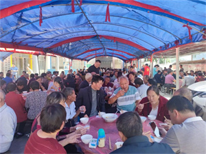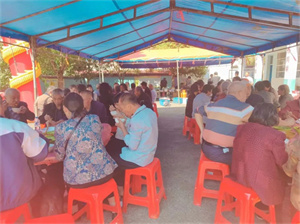 长平村、流江村、佛溪村邀请老人们聚餐,志愿者们搀扶着行动不便的老人就坐,大家围坐在一起聊天说笑,共同品尝美食,分享邻里趣事,脸上洋溢着幸福的笑容,餐桌上弥漫着欢声笑语,十分热闹。
