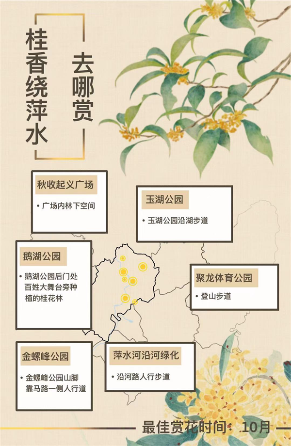 桂子月中落,天香云外飘。每当金桂飘香之时,萍城的秋日总是格外惬意。萍乡市园林管理中心为大家带来一份桂花观赏地图,供广大游客朋友作为参考,方便大家在桂香浮动的凉爽秋日里可以寻找适合自己的赏桂地点。