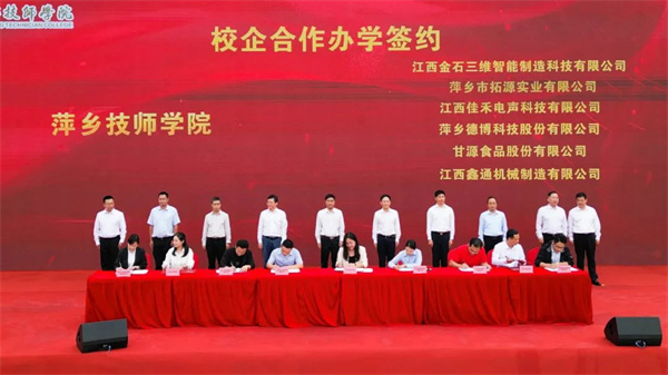 ▲萍乡技师学院与六家深度合作型企业及六家战略合作型企业进行现场签约