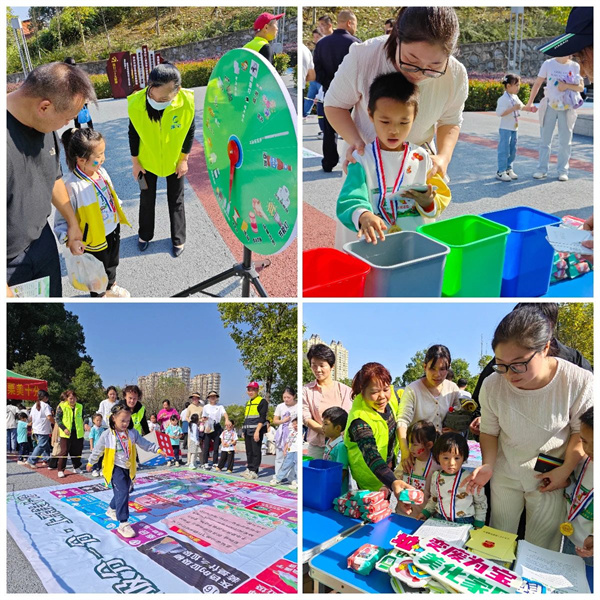 适逢当天上栗县中心幼儿园在公园内举行运动会。当垃圾分类遇上活力十足的小朋友后,点燃了一场别开生面的“趣味环保运动会”。本次环保运动会将趣味游戏和垃圾分类知识宣传相结合,精心设置了分类大转盘、卡片分类接力赛、分类飞行棋等项目,通过寓教于乐的方式,让生活垃圾分类知识潜移默化的浸润进孩子们的心里。