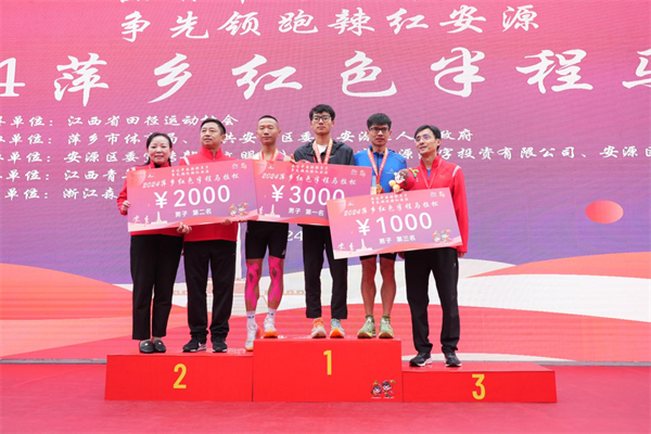 来自市体育局和安源区的领导嘉宾为获奖的男子组与女子组运动员颁奖。