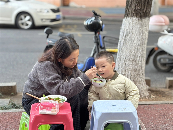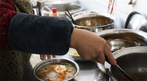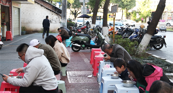 每天早上七点左右,位于东大街新城路的“婆佬面馆”就热闹起来。只见彭老板正在准备各式各样的臊子,她的女儿“娥姐”动作娴熟地煮面、捞面,店员们也忙得不亦乐乎。食客们络绎不绝,排起长队,店内很快座无虚席。好多老顾客更是端着面条直接坐在门口的塑料板凳上嗦米面,这俨然成为老街上一道亮丽的风景线。