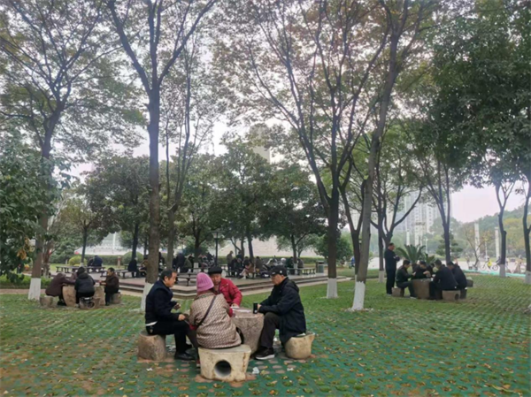 如今,树林里补种了许多诸如兰花三七、八角金盘、石蒜等植物,地面铺上了植草砖用来步行,砖缝间青青绿草冒出了头,瞧着毛茸茸、绿油油的,给冬日带来一丝鲜活。除了地面的变化,地上还多了几组石头桌凳,瞧着质朴自然,在树林环绕间很是和谐。市民们三三两两环绕石桌而坐,有的在闲聊,有的在下棋,还有的在锻炼,阳光透过树叶照射进来,整个林下空间开阔宽敞又明亮。往日空闲逼仄的树林变成了闲适美好的一角,真是赏心悦目。