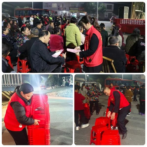 12月4日晚6点半,上栗县学习宣传贯彻党的二十届三中全会精神暨“崇俭尚德倡文明·移风易俗数新风”文艺巡回在洪东村村委会上演。洪东村新时代文明实践站组织志愿者精心布置会场,耐心维持秩序,打造良好演出环境。演出前,志愿者积极地向前来观看演出的村民宣传医保政策,发放宣传单,提高村民健康保障意识;还贴心地帮助老年人完成养老保险认证,用行动诠释志愿者奉献精神。