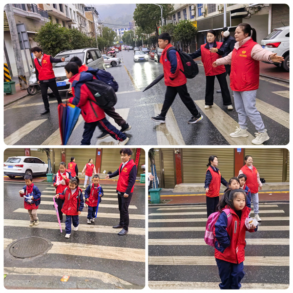 12月5日早上,在桐木镇中心小学门口的马路边上,桐木社区新时代文明实践站的志愿者组成的护校队伍,如同一股温暖的力量,准时出现在这条上下学的道路上。他们身着红马甲,引导过往车辆有序通行、规范停放,小心地护送学生通过马路,提醒司机减速慢行,为孩子们铸就了一道安全屏障,让文明交通的理念在校园周边生根发芽。