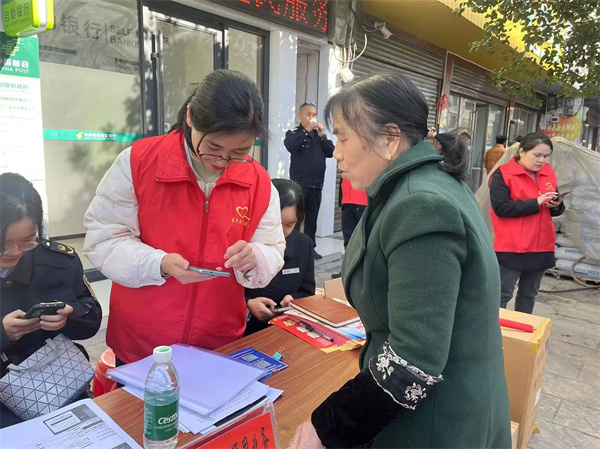 趁着湖塘村赶集日的人潮,镇村干部纷纷化身志愿者,在热闹的街道上设置志愿服务点,向过往的村民宣传社保医保政策,提供养老待遇领取资格认证,网上缴纳社保、医保等集中帮办服务。