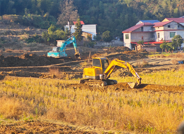 大雪时节,正是农闲之时,然而在杨岐乡水井村,只见数台挖掘机在田间穿梭,巨大的机械臂精准地搬运着泥土,呈现出一派热火朝天的别样景致。