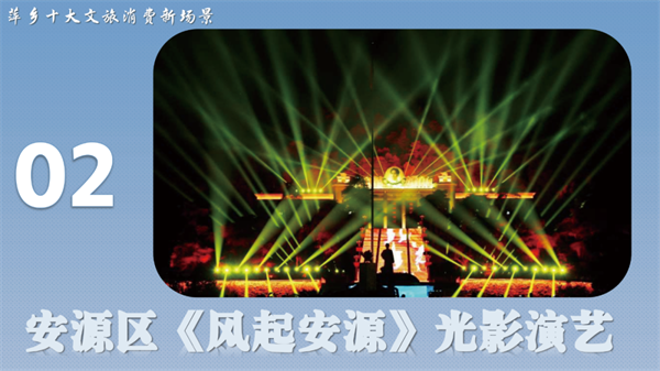 整片主题分为:风起安源、江南煤都、工运摇篮、秋收起义、红领巾摇篮、走进新时代六个篇章。以灯为媒,以光为介,作为红色旅游新业态,光影演艺为文旅融合注入了新元素,为萍乡夜间经济增添了时尚科技与新活力,也是提升游客夜游安源的原动力。