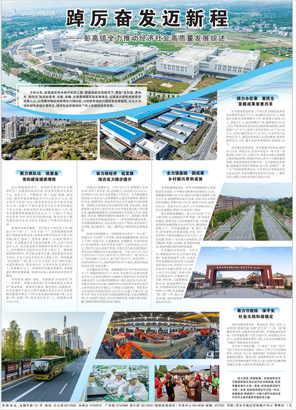 今年以来,彭高镇在萍乡经开区党工委、管委会的坚强领导下,聚焦“走在前、勇争先、善作为”的目标要求,完整、准确、全面贯彻落实新发展理念,以固本兴新的觉悟抓党建聚人心,以夺旗冲锋的举措强实力增后劲,以抓铁有痕的力度抓安全保稳定,以久久为功的韧性美城乡惠民生,经济社会发展保持了向上向前的良好态势。