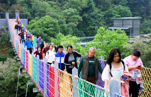 孽龙洞景区亦是焕然一新。新建的售票大厅宽敞明亮,现代化的设施与人性化的服务,让游客的旅程从踏入景区的第一步便感受到便捷与舒适。神龙谷中,空气仿若被大自然精心过滤,弥漫着泥土与草木的芬芳。七彩百步铁索桥似梦幻彩虹横跨于山谷之间,连接着不同的景致,行走其上,欢声笑语回荡在山谷。观景平台宛如巨人的眼眸,将山峦起伏、绿树葱茏的美景尽收眼底,让人心胸豁然开朗。观光电梯的出现,打破了垂直空间的阻隔,为不同年龄层次的游客提供了轻松游览的可能。神龙秘境、御龙台酒文化体验中心神秘,引人探索。南法风小院山里打盹以其清新脱俗的风格,成为赣湘两地青年的向往之地,他们在此拍照打卡,留下青春的美好印记。后山徒步游步道沿着山体的脉络蜿蜒伸展,每一块石头、每一棵树木都见证着徒步爱好者们的坚毅与热情,他们在这方天地里与自然亲密对话,可听鸟鸣,可森呼吸……