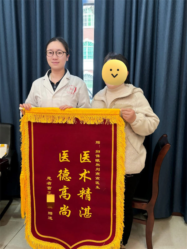 怀疑犬弓蛔虫感染,建议马上转上级医院,医生立即与上海交通大学新华医院眼科主任联系。家长和孩子当天就出发去了上海,经过一系列的检查,最终确诊为犬弓蛔虫感染,孩子经玻璃体切除光凝手术后,视力最终保留了指数/70cm。家长为了表示感谢特意送来了这面锦旗。