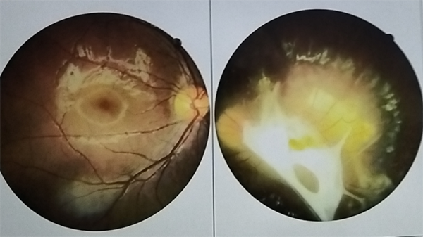 外斜视-15度,右眼视力1.0,眼压21mmHg,右眼角膜透明,前房深度正常,虹膜纹理清晰,瞳孔圆,晶体透明,眼底网膜平;左眼指数/40cm,眼压19mmHg,左眼角膜透明,前房深度正常,虹膜纹理清晰,瞳孔圆,眼底视盘界清 ,后极肉芽肿病灶,视盘前增殖膜,颞上周边白色肉芽肿;屈光检查右眼0.50=1.0 左眼+5.00/-0.50x175=指数/40cm。