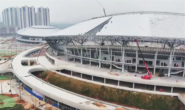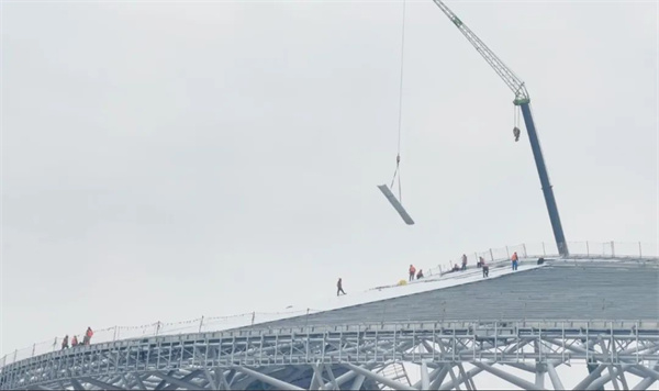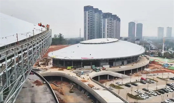 作为市奥体中心的核心部分,未来能容纳22000名观众的体育场尤为引人注目,其银色的屋顶在阳光的映照下熠熠生辉,线条流畅而优美,宛如美丽“萍实”。屋面上,施工人员正忙碌地进行着金属屋面的安装工作,对最后几个区域进行细致的拼接和固定,预计一周左右的时间,金属屋面就能全面安装完工。