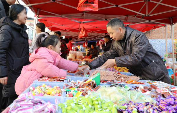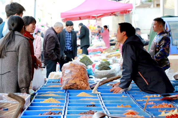 “上栗很多赶集的地方,我们都去过,虽然这里是村上赶集,但人流量大、生意不错,平时赶集一天也能卖三四千元,年关可卖上万元。同时,在这也不收摊位费,只要交两三块钱卫生费就行。”来自上栗县城的商贩林大哥说,这次带了俩车货过来,有各式各样的年果子。