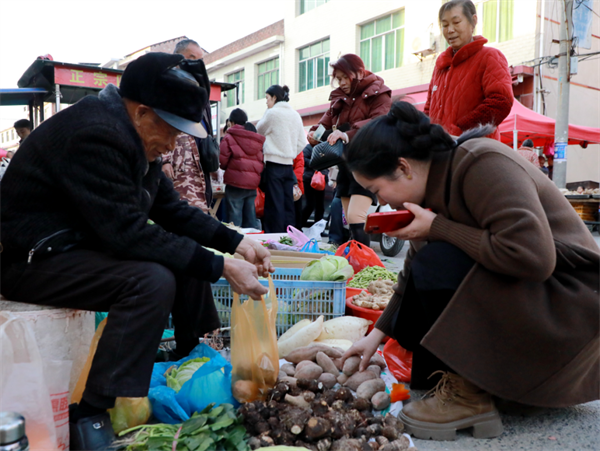 在集市中间的一个路口,周田村老党员黎加全也摆了个摊位。每次赶集,他都会弄些自己种的蔬菜、做的扫帚等到集市上卖。“白菜1块一斤,芋头3块一斤,苹果红薯两块一斤,扫帚16块一个……”黎加全开心地说,刚才有个大客户,一次性买了20斤红薯嘞。